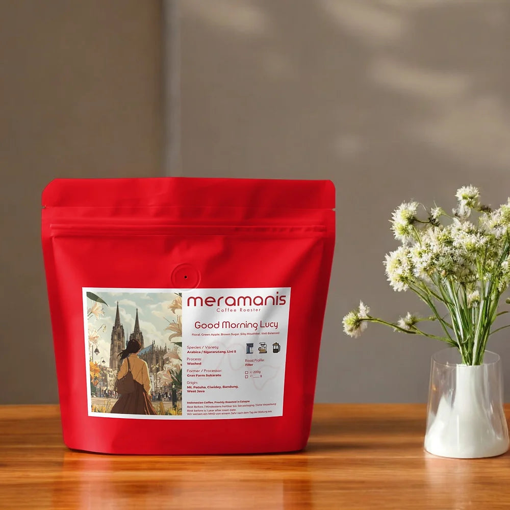 Meet Good Morning Lucy, the first coffee in our new Good Morning series. It greets you with a delicate floral aroma, led by a smooth chamomile notes, wrapped in a velvety sweetness. No sharp acidity, just pure balance, warmth, and a cup that sets the perfect one for your day.